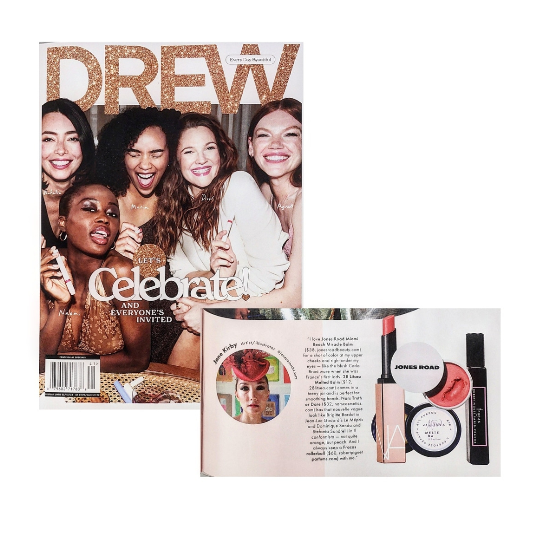 Melted Balm highlighted as Jane Kirby's "never leave home without" products in Drew Barrymore's Drew Magazine.