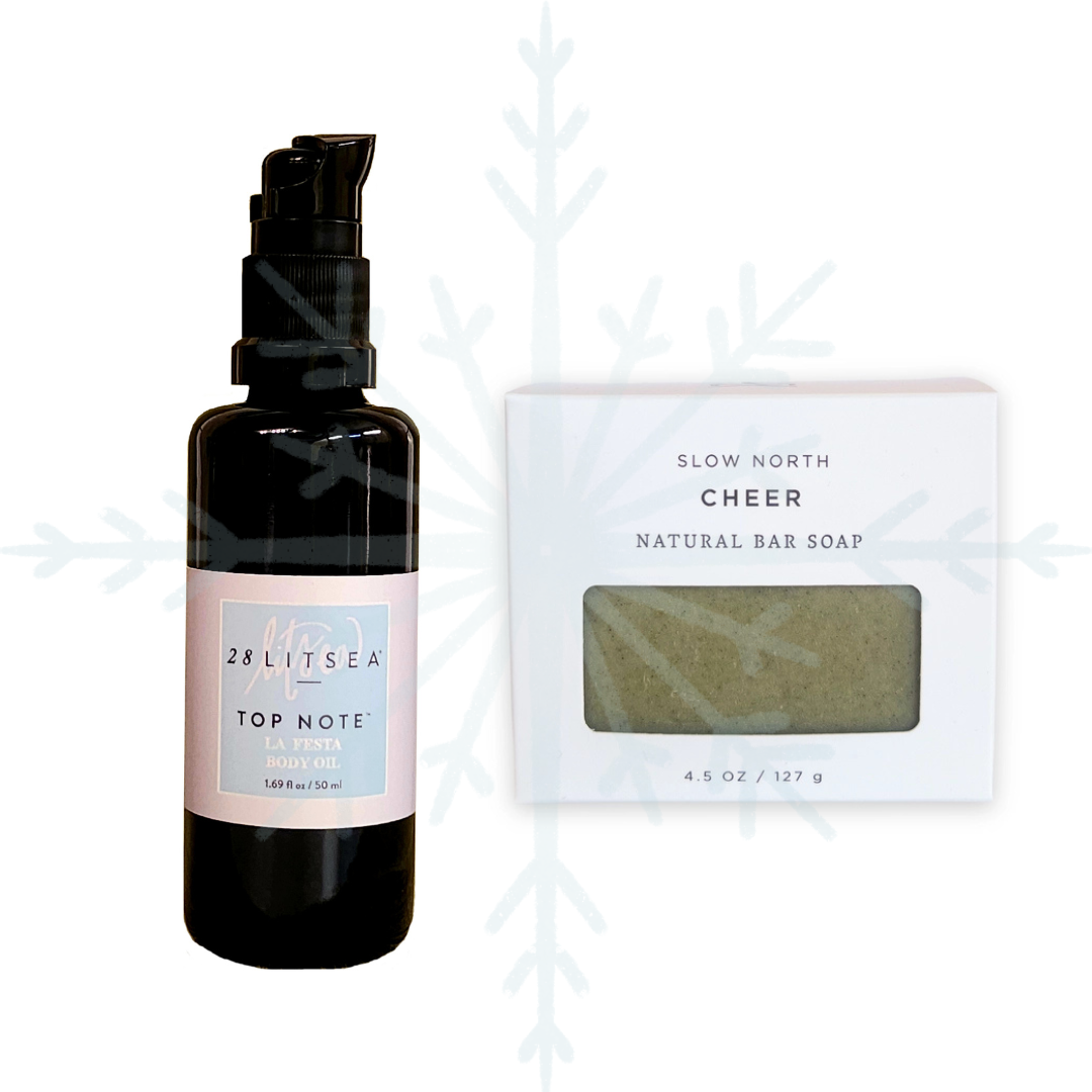 This limited edition set features our winter seasonal Top Note La Festa Body Oil and Slow North's Cheer - Seasonal Bar Soap.